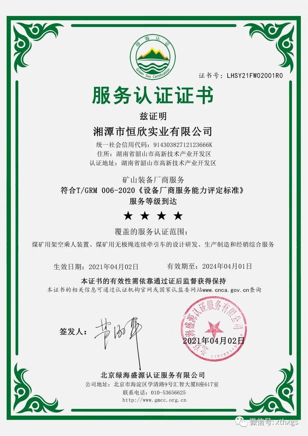 The four-star certification of mining equipment manufacturer services is conducted by Beijing Green Sea Shengyuan Certification Service Co.,Ltd.in accordance with the T/GRM008-2020"Equipment Manufacturer Service Capability Evaluation Standard"to conduct on-site certification of the service capability of Xiangtan Hengxin.After conducting on-site inspections,exchanges,and reviewing relevant materials with a fair and professional attitude,the audit experts conducted a comprehensive evaluation of the service capabilities of Xiangtan Hengxin.