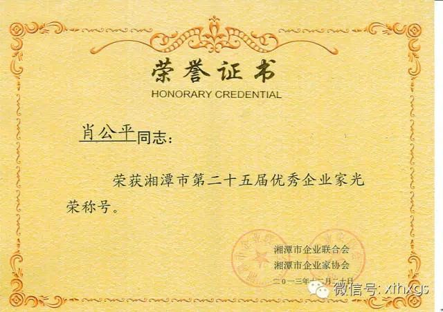4.Personal Honors of the Chairman of"Xiangtan Hengxin":In 2013,he was awarded the title of"25th Outstanding Entrepreneur of Xiangtan City"and"First Moral Model of Shaoshan City".